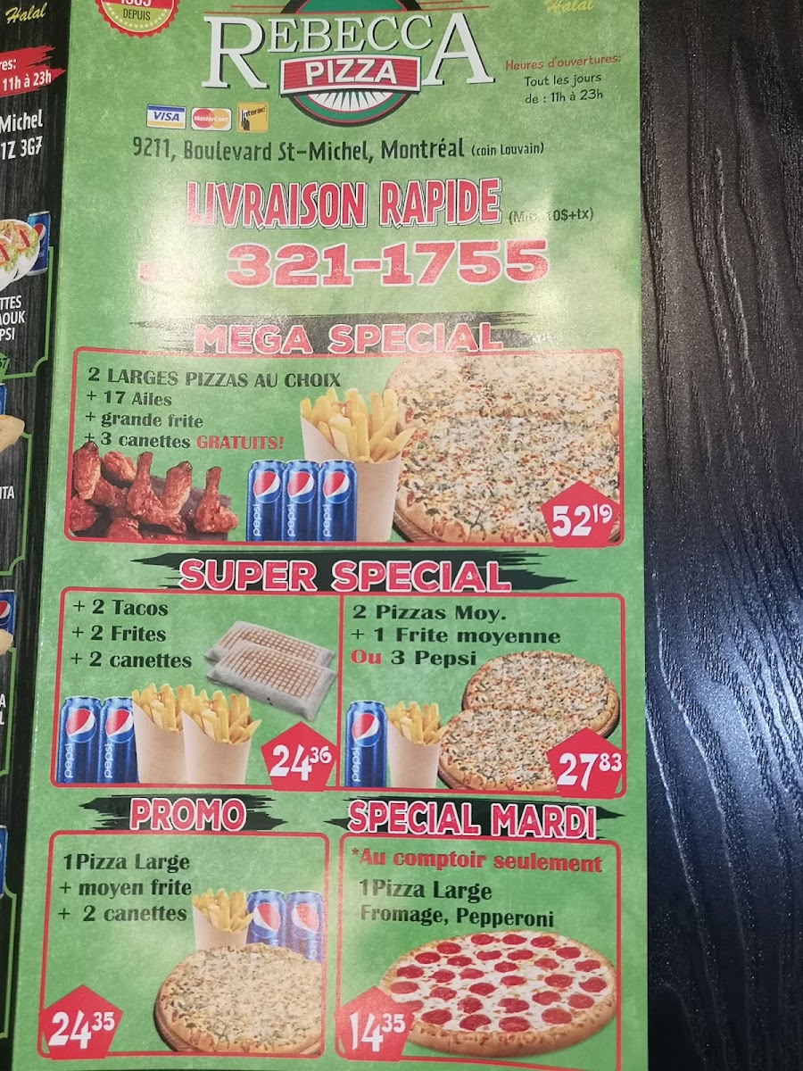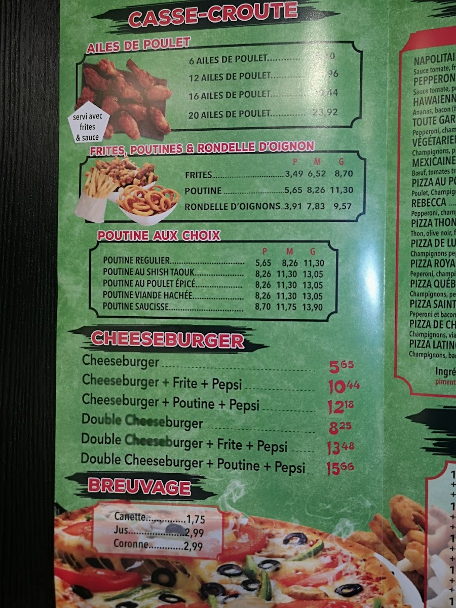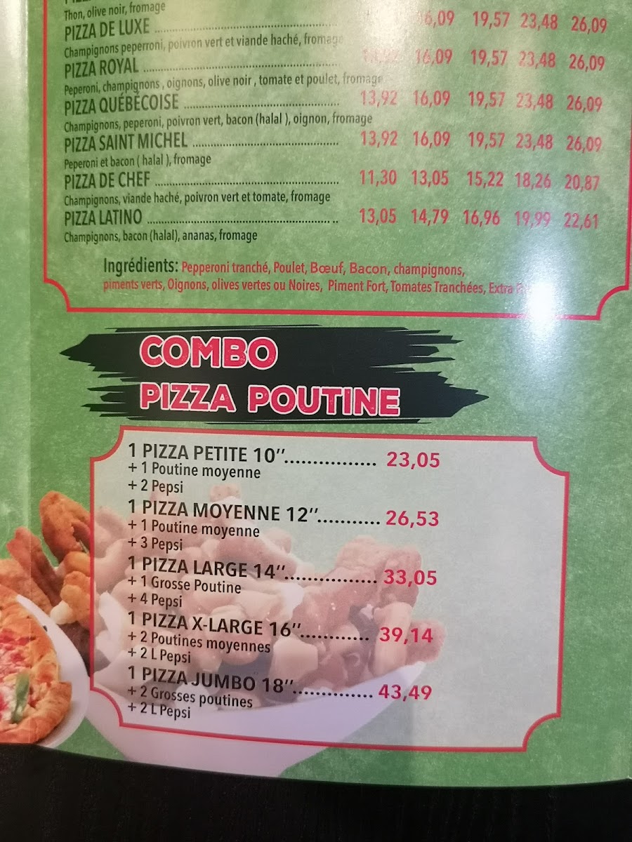 Les Trios features various pizza combinations available in multiple sizes, ranging from petite to jumbo. Options include orders of two pizzas as well as single pizza selections, accommodating both individual diners and larger groups.